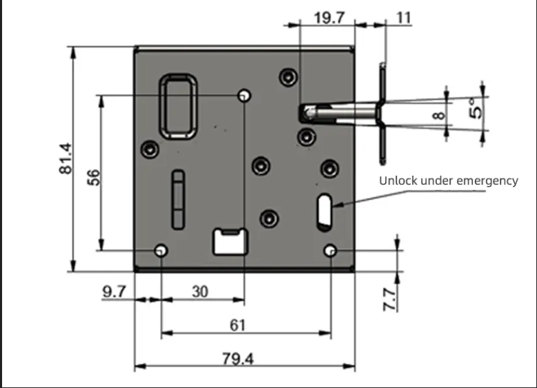 Please see the picture below. On the side of the lock there is an opening just beneath the latch (highlighted as “unlock under emergency” in the picture). Using a small tool, such as a precision screw driver, insert into the slot and then pull down. This will release the lock.